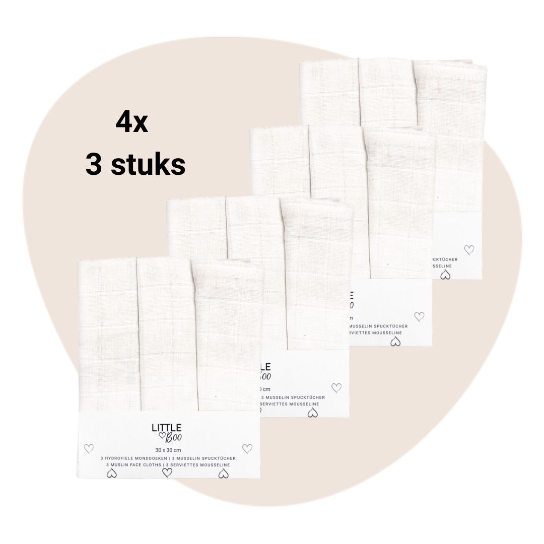 -56%Set | 4 x Monddoekjes Little Boo Uni White 3-pack | 12-delig Deze fijne set met 12 monddoekjes is van het merk Little Boo. Ze zijn gemaakt van 100% katoen. Daardoor zijn de monddoekjes comfortabel, erg zacht en dus perfect voor het tere babyhuidje van je kindje. De monddoekjes zijn goed ademend, nemen snel vocht op en zijn sneldrogend. Eigenschappen Merk: Little Boo Afmtingen: 30 x 30 cm Materiaal: 100% katoen Multifunctioneel Superzacht, goede vochtopnamen en droogt snel Wasbaar op 60 graden Geschikt voor in de droger, maar kan ook drogen aan de waslijn Mag heet gestreken worden (ongestreken nemen ze meer vocht op)